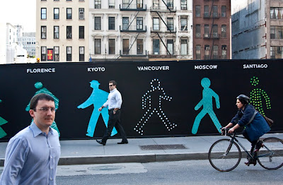 Last month, they put up a billboard with figures of people walking with city names above the characters. I thought this was fascinating, and would be fun to try to take pictures of real people walking next to the icon people.